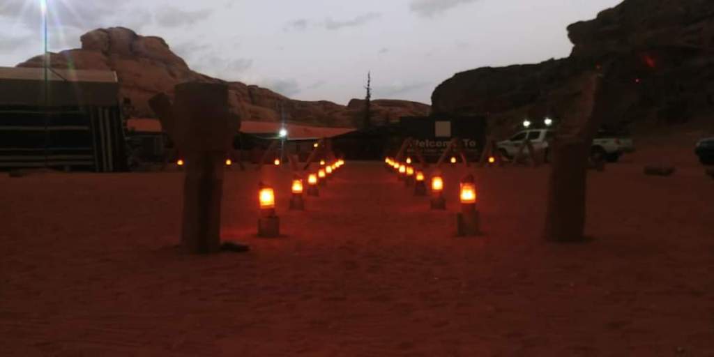 Lors de notre retour au camp, des petites lanternes Ă©taient allumĂ©es dans la montagne Ă cĂŽtĂ© ainsi que sur les passages reliant le camp aux petits tentes bĂ©douines oĂč nous allons passer la nuit.