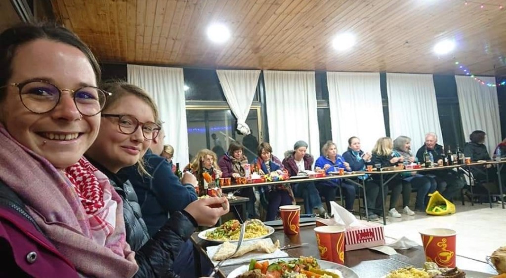C’est finalement dans une petite cantine que nous nous sommes installĂ©s. Nous devons nous annoncer pour le souper qui sera 1h aprĂšs notre arrivĂ©e. Beaucoup de monde s’activait en cuisine car nous Ă©tions facilement une trentaine dans cette petite cantine. En attendant que le repas soit prĂȘt, nous avons fait la connaissance d’une jeune Californienne qui rĂ©alisait un travail de recherche sur la Jordanie. Finalement, nous lui avons appris a jouer au chibre. MĂȘme des Jordaniens sont venus regarder et jouer avec nous. C’Ă©tait un moment de partage unique, nous parlions tous des langues diffĂ©rentes et malgrĂ© tout, nous avons tous rigolĂ© et nous nous sommes tous amusĂ©s.